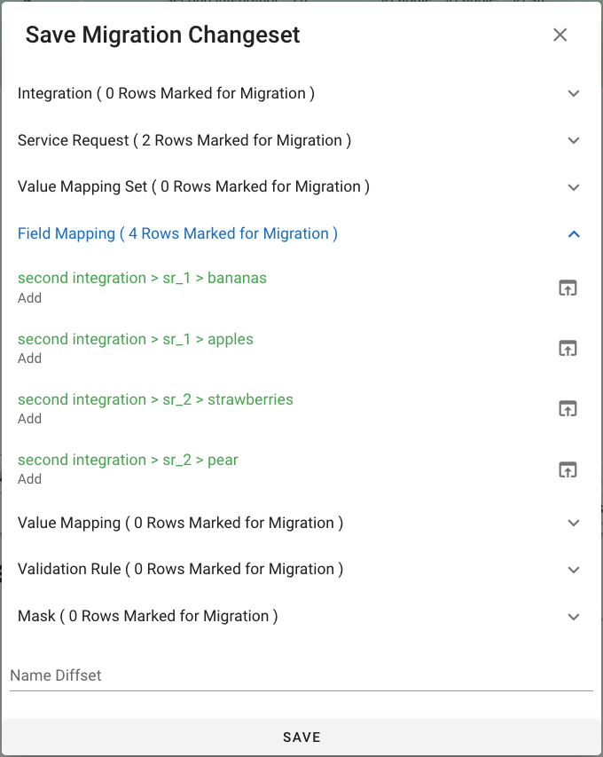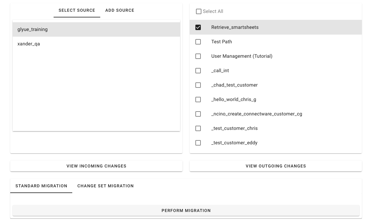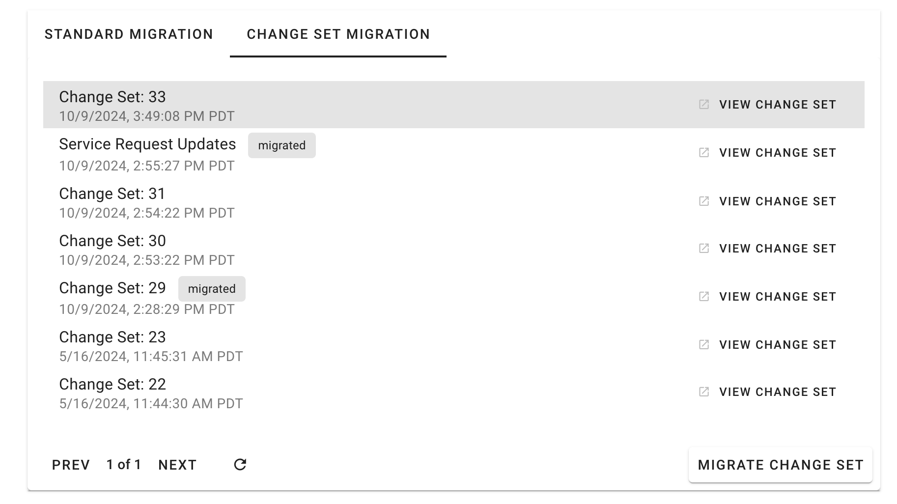On the Migrate page, reselect the source system and integration. Then select the Change Set Migration mode, select the changeset you created in step 5, then click Migrate Change Set.