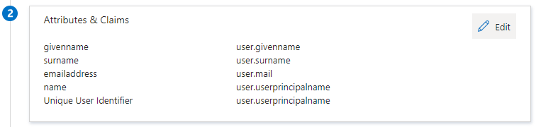 On the application **SAML-based Sign-on** page, in section **2 Attributes & Claims** click **Edit**.