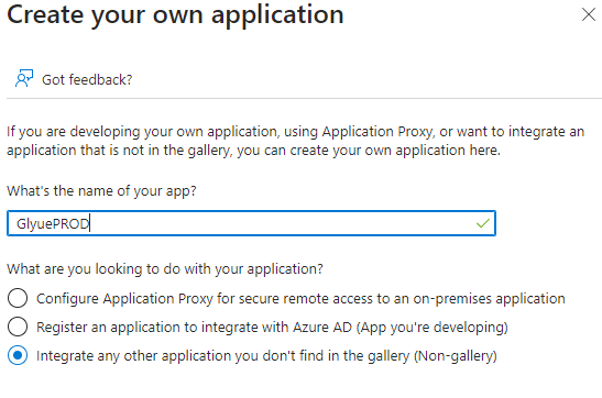### Create the Integration Gateway Enterprise Application <a href="#azuresso-basicsetuphowto-createtheglyueenterpriseapplication" id="azuresso-basicsetuphowto-createtheglyueenterpriseapplication"></a>
