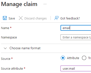 Enter `email` in the **Name** field. For **Source Attribute** select `user.mail`. Click **Save** in the top-left.